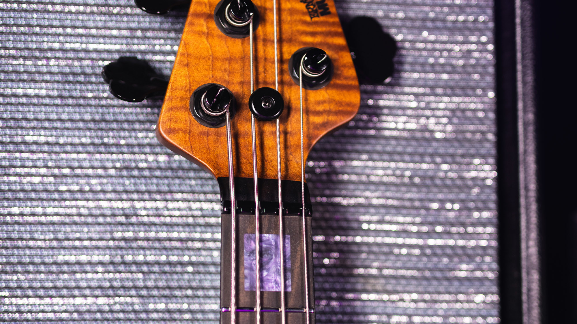 Figured roasted maple neck with an ebony fretboard adorned with custom Purple Atlante block inlays.
