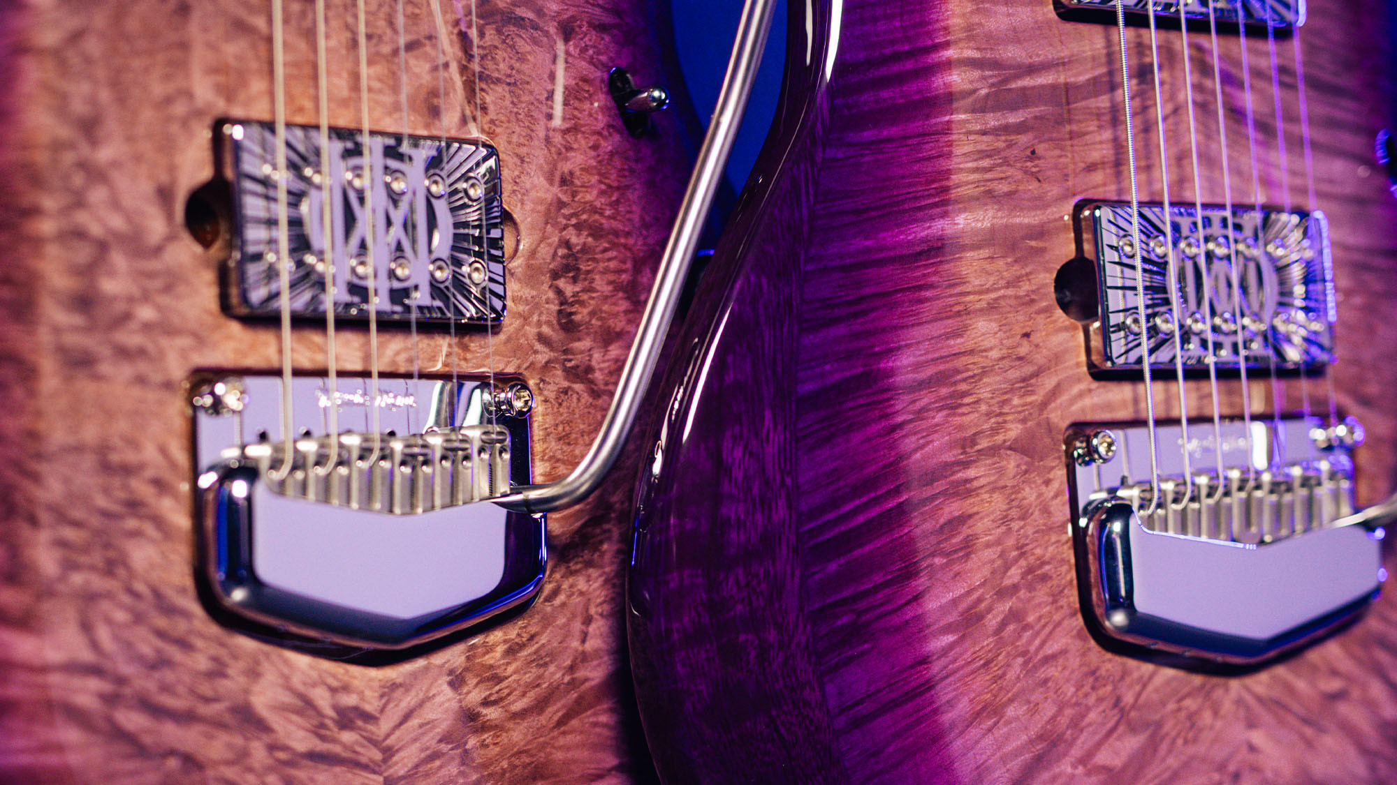 The Wolf’s Bane translucent Purple finsh has Black Limba back and sides centered around a premium figured Burl maple top.